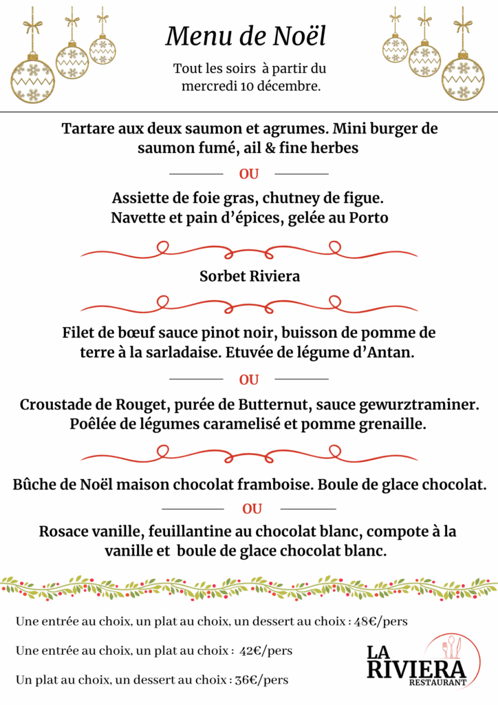 Vous y trouverez aussi toutes les actualités de La Riviera : menus spéciaux, nouveautés en cuisine, fermetures exceptionnelles ou événements à venir.